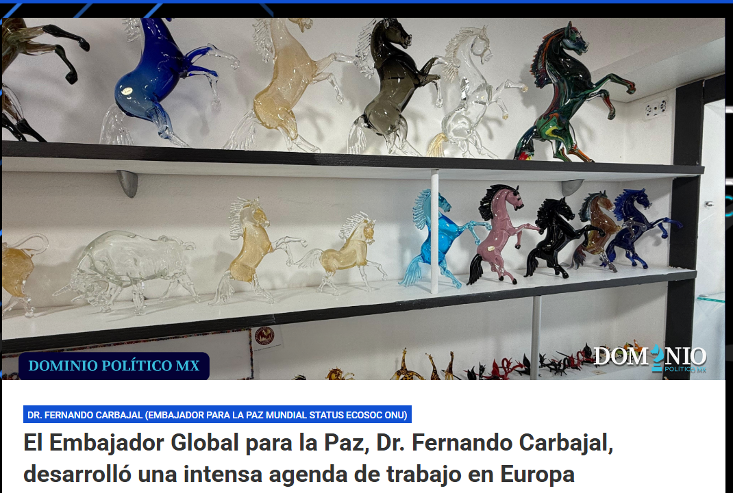 El Embajador Global para la Paz, Dr. Fernando Carbajal, llevó a cabo una destacada agenda de trabajo en Europa, orientada a fortalecer la vinculación empresarial, promover el intercambio de experiencias y generar nuevas oportunidades de cooperación internacional. Su recorrido incluyó actividades en la ciudad de Roma y en la emblemática isla de Murano, en Venecia, consolidando una presencia activa en espacios clave del entramado productivo y emprendedor europeo.